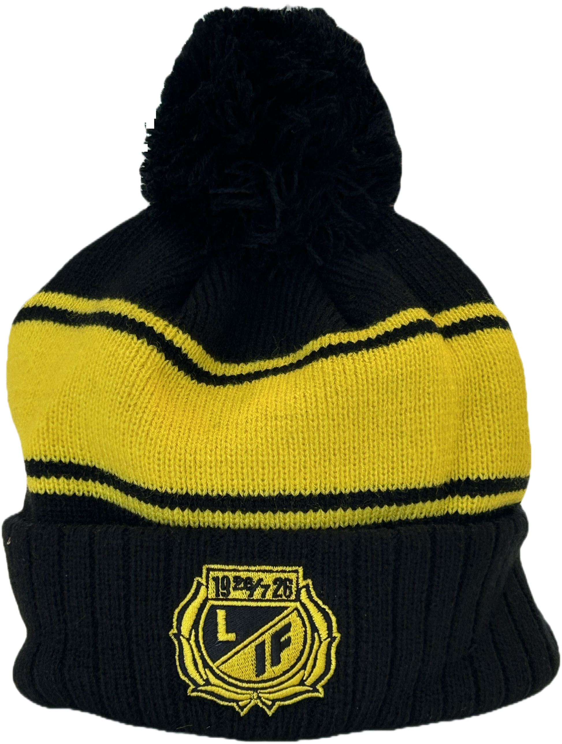 Stickad tofsmössa med gul LIF-logga och gula ränder. Perfekt för kalla vinterdagar.